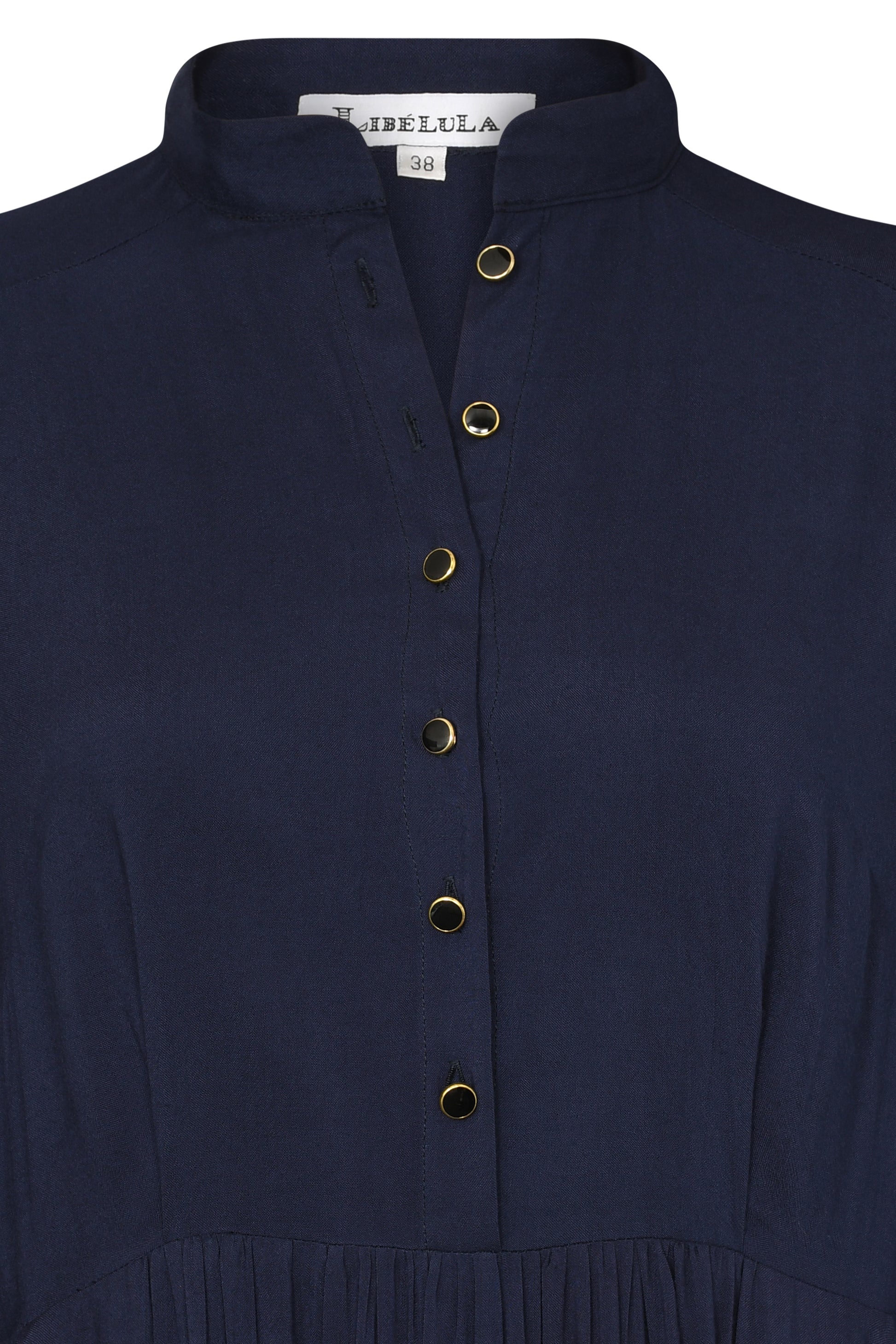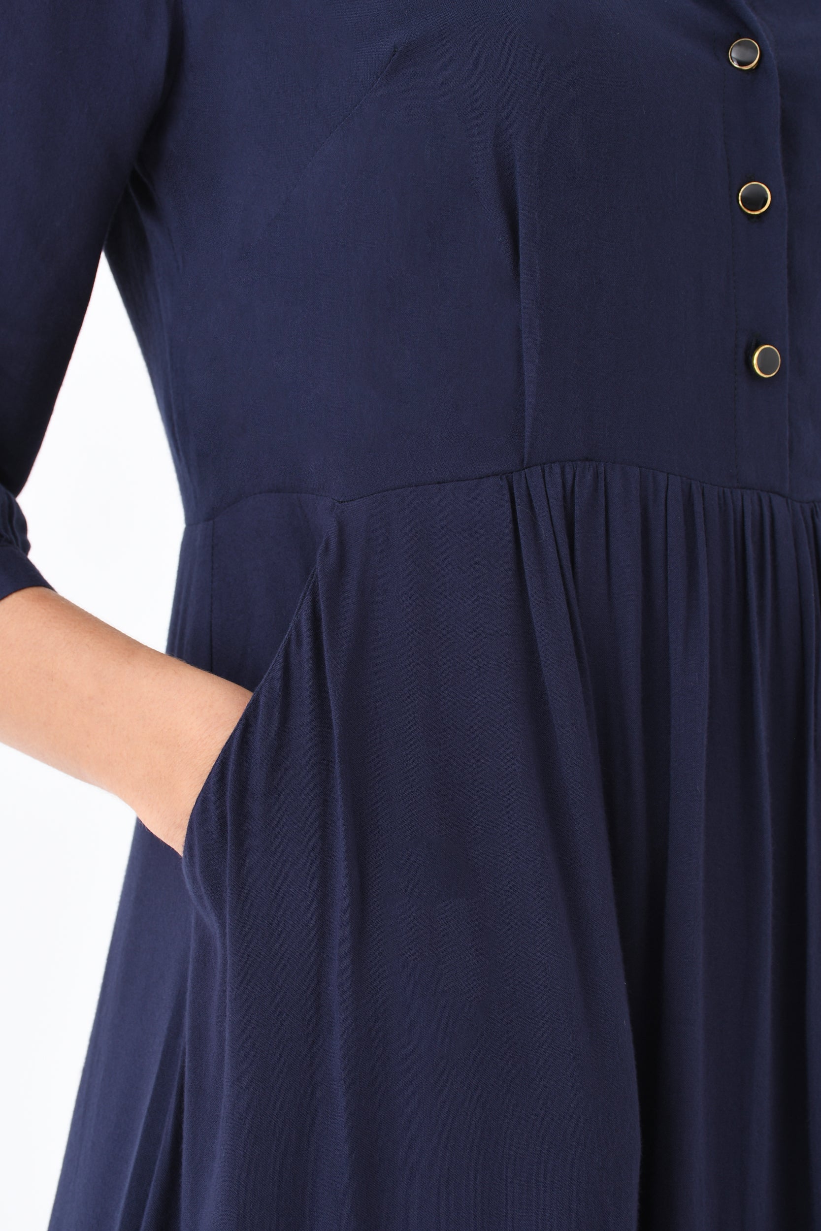 This Anastasia Dress in super soft plain navy rayon is an everyday classic. We all live in them, they are super comfortable and can be washed in a cold wash. They skim the waist and have pockets just under the waist seam. There is a deep, non frilly frill at the hem and buttons down the front bodice.