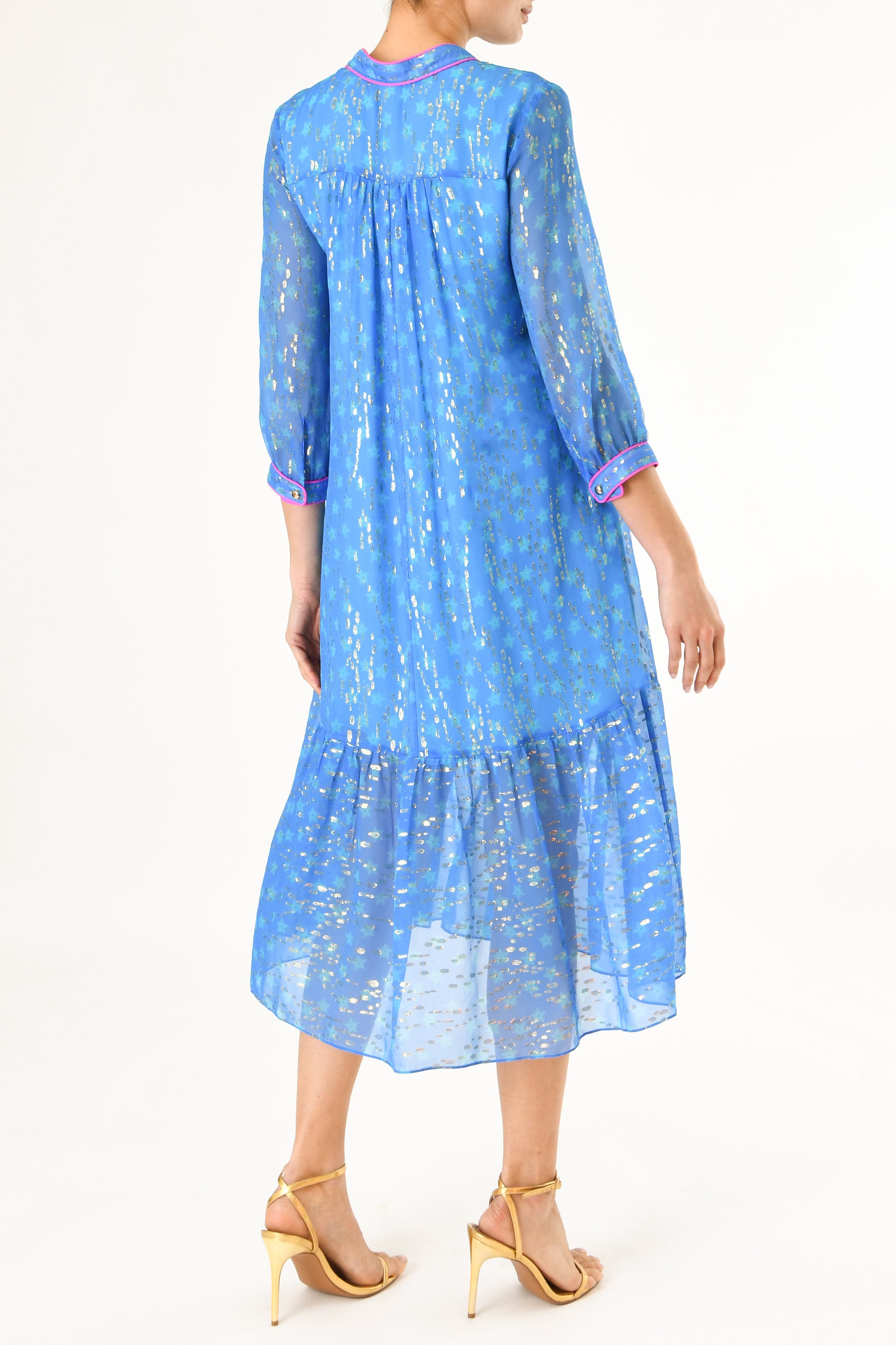 Both flattering and comfortable this Longer Claude Dress is a stunner! In a stunning blue silk with shimmering golden dots woven into it, this is definitely a dress for event dressing, drinks parties, dinner parties, the opera, the silk is a great weight of fabric that will work all year round.