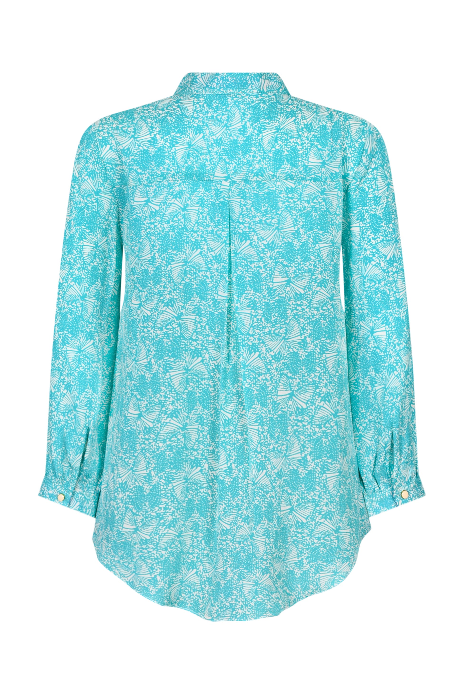 Our bestselling Delphine Top is stunning in the vibrant yet subtle Flutter printed silk georgette in Aqua with a light bright blue trim on the inside of the collar and cuffs.