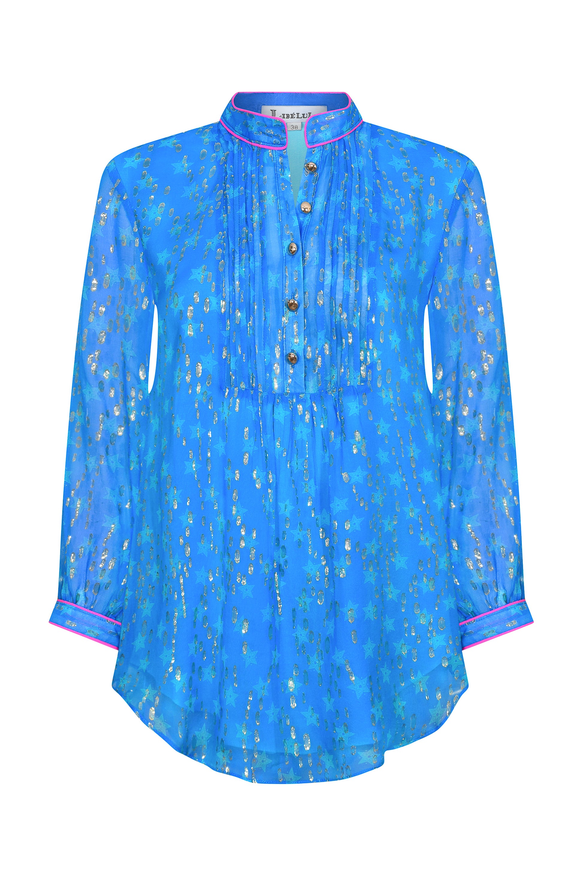 As flattering as it is stylish our Delphine top is a perfect choice for formal occasions. Crafted from a delicate silk georgette with shimmering golden dots woven into it.