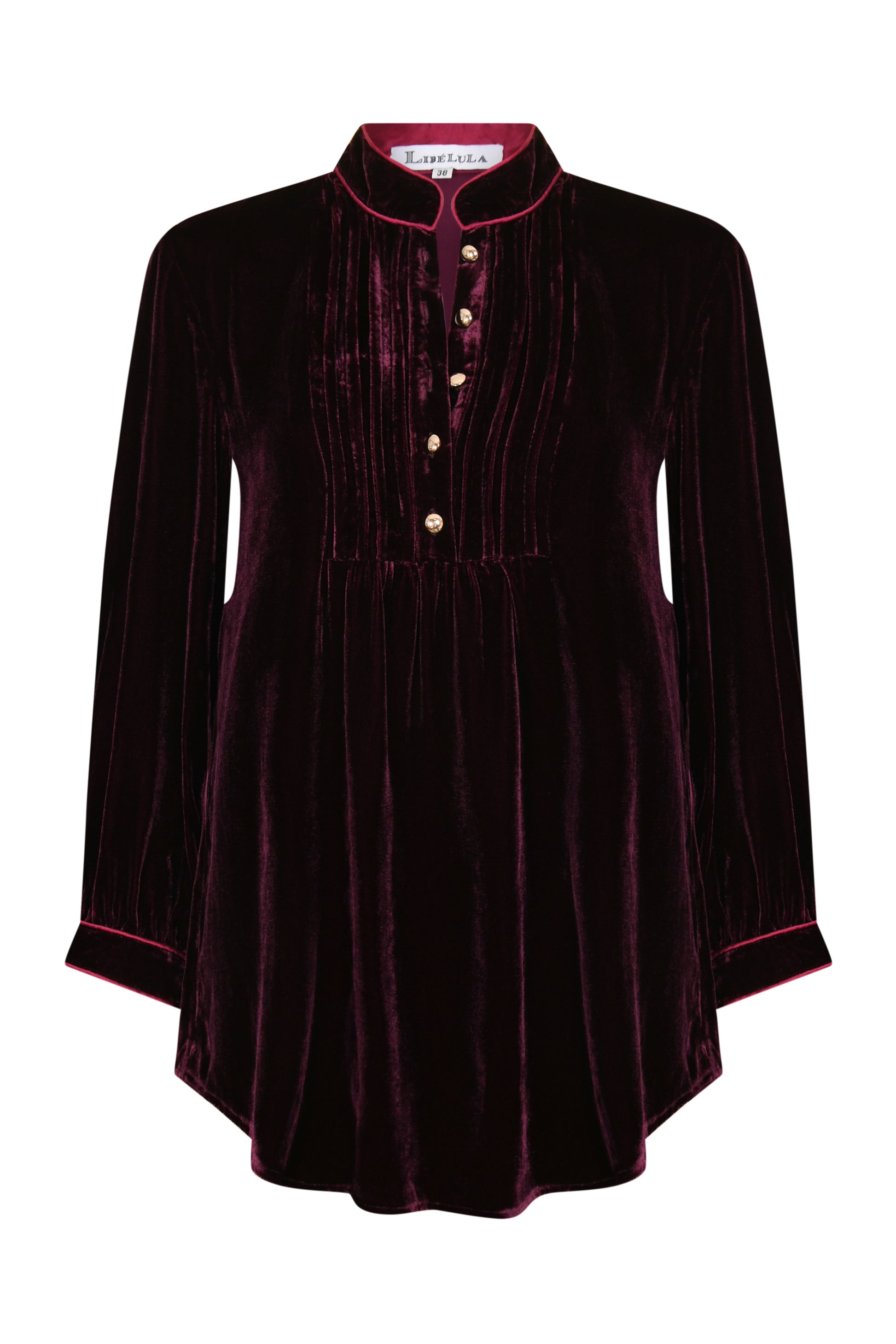 This Libelula staple is, of course, back this Autumn/Winter in our most sumptuous, winter appropriate fabrics. This Delphine Top comes in Velvet in the new Burgundy colour way. The Delphine Top features pin tuck details with buttons with a flattering mandarin collar and a dip hem front and back to give a extra coverage. A staple to Libelula and a staple for your wardrobe too.
