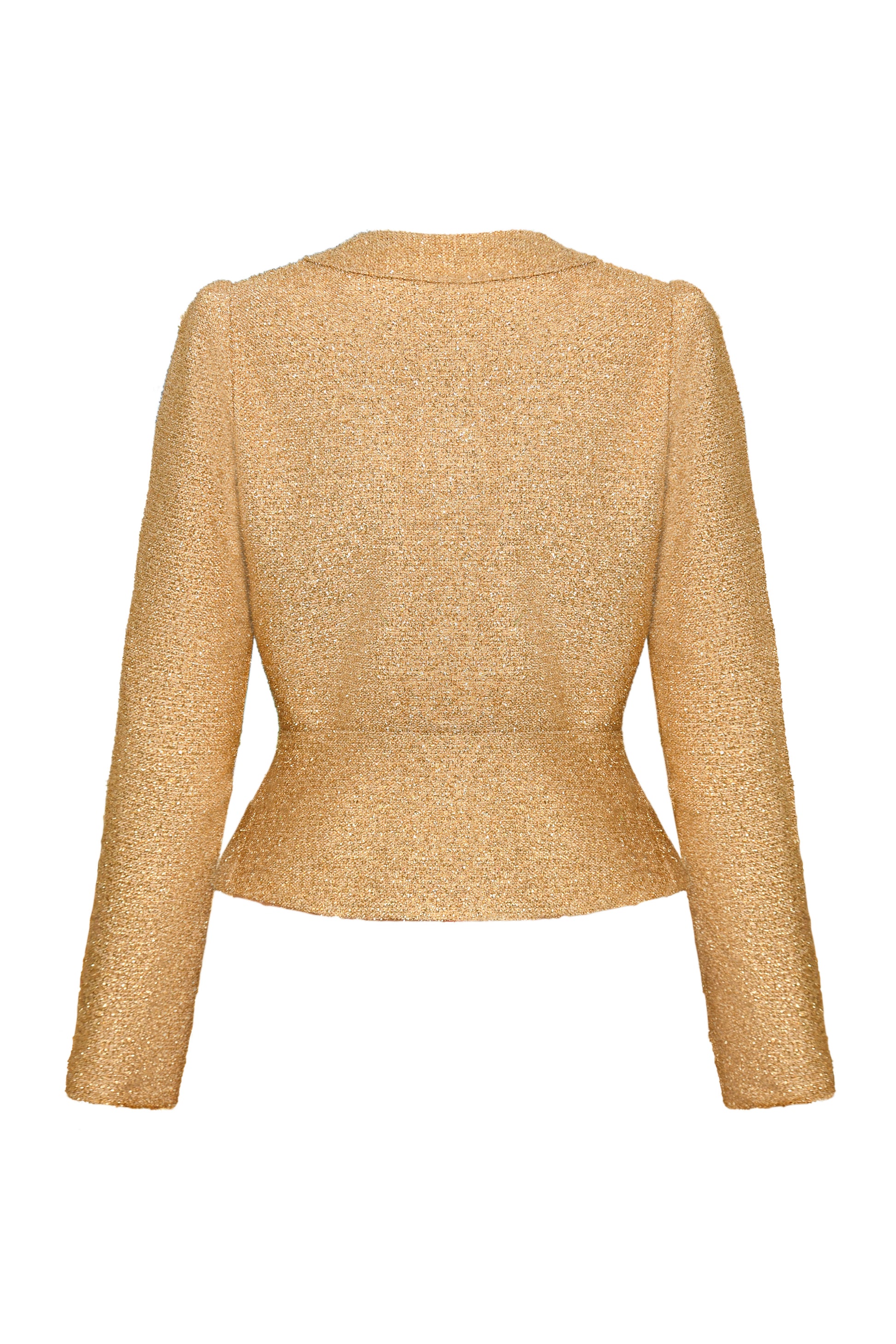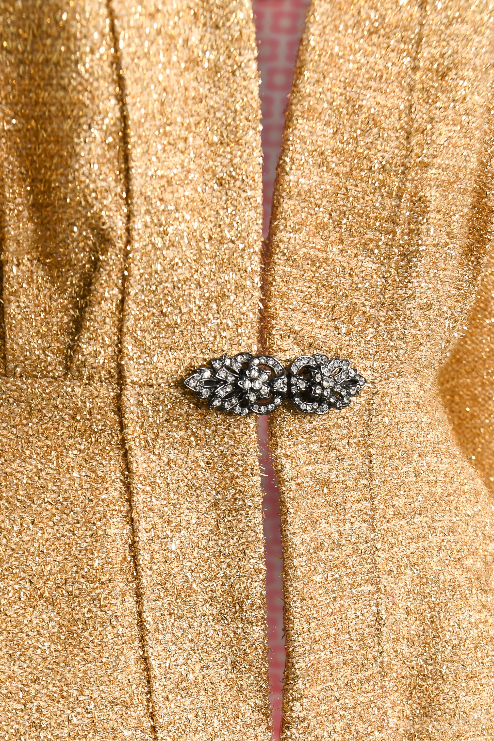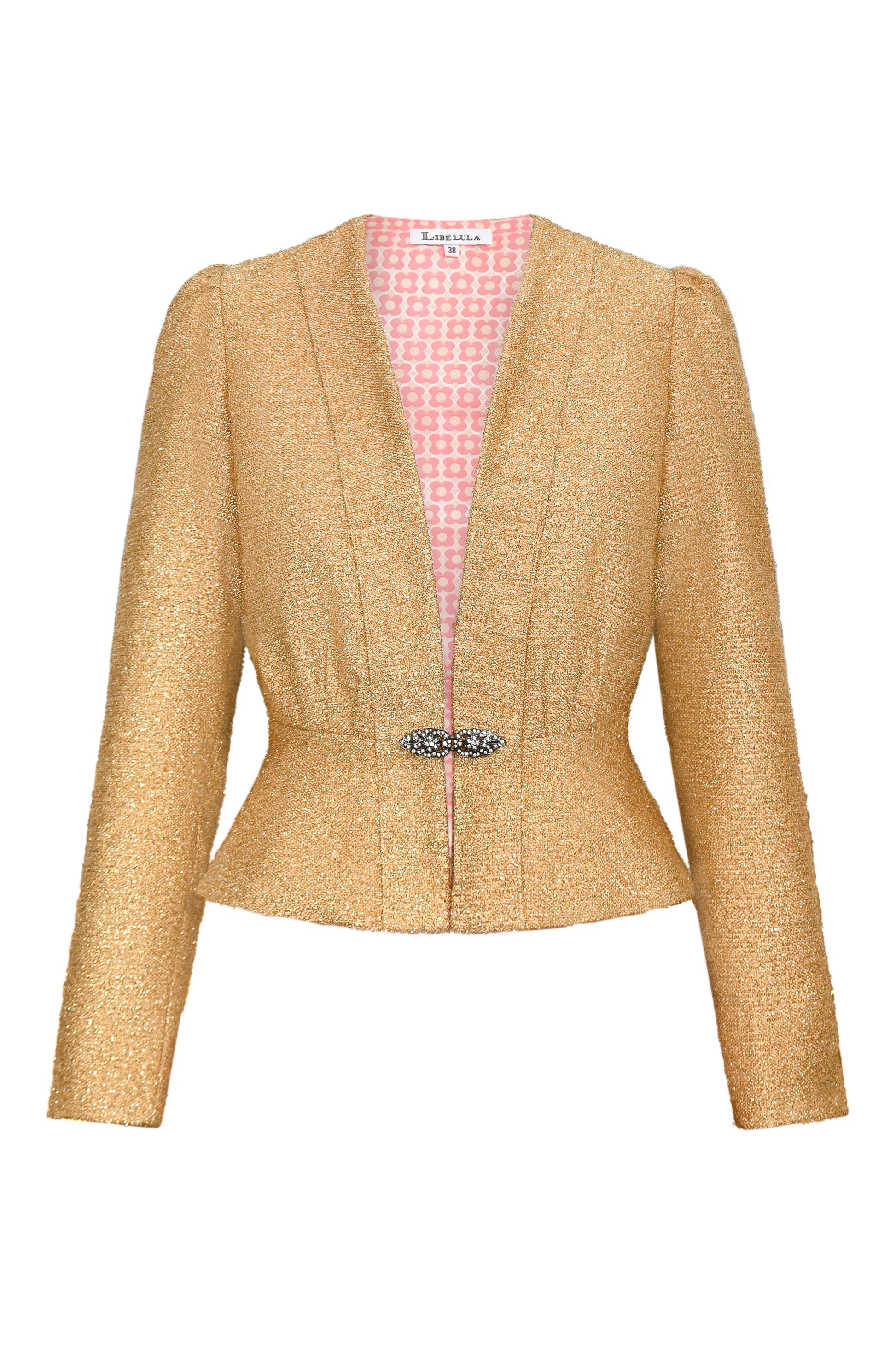 A shorter version of one our most popular pieces, the Dulwich Jacket comes in this fabulous gold sparkling material. This jacket can be dressed up for smart events or down for everyday wear, a real staple for every woman's wardrobe. The jacket fastens with a beautiful diamante brooch.