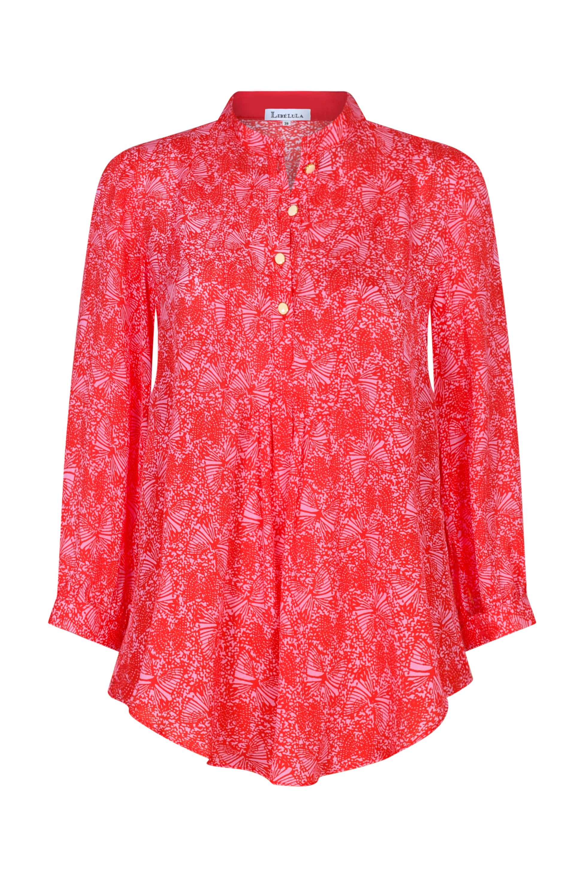 The Goodie top comes this season in our new Flutter Printed Silk Georgette in pink. It is a gorgeous, fluid silk, and the print is vibrant yet subtle - perfect for taking you from day to evening. It has a rounded hemline that drops slightly longer to the back and 3/4 length sleeves and is set off with gorgeous cream, enamel buttons.