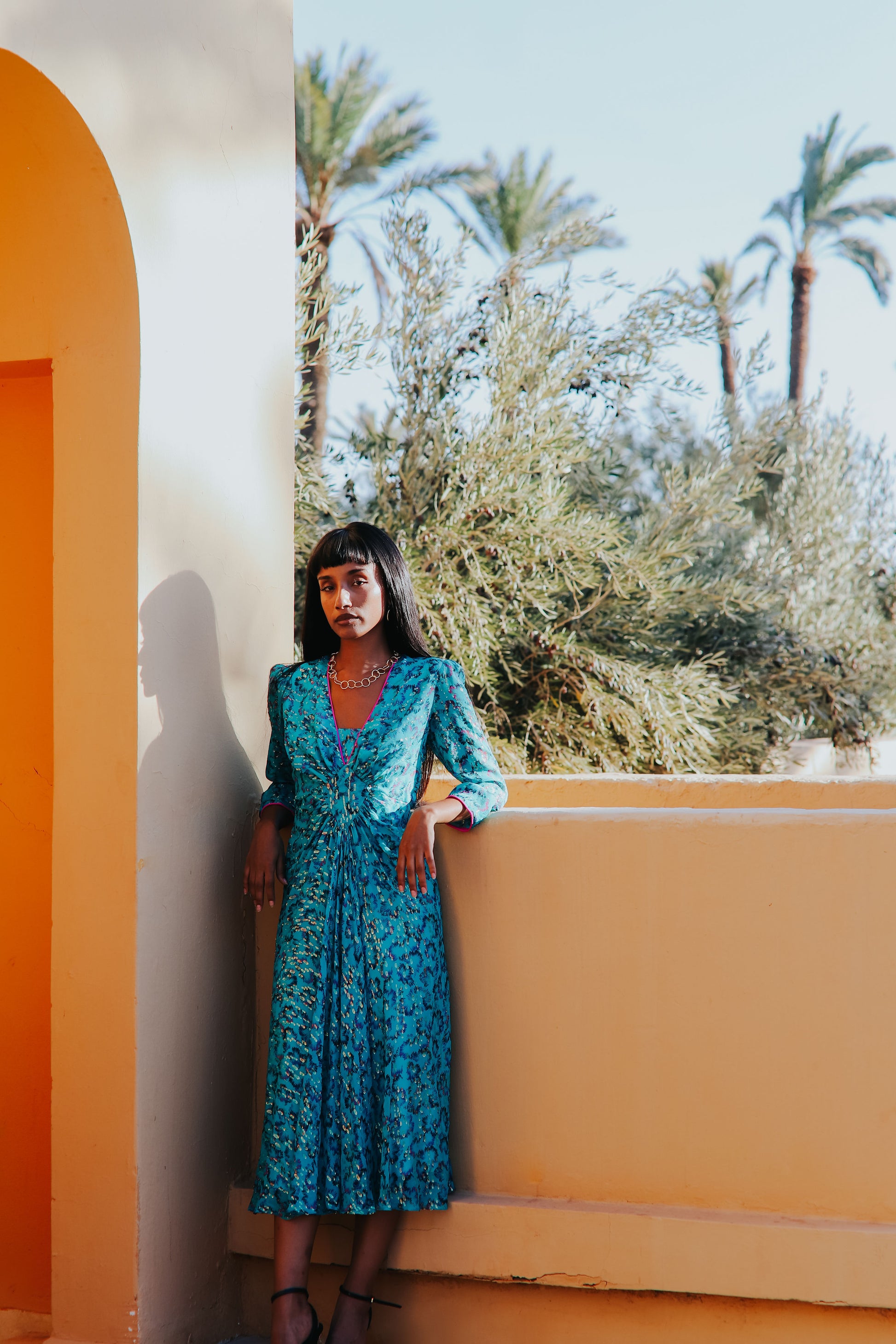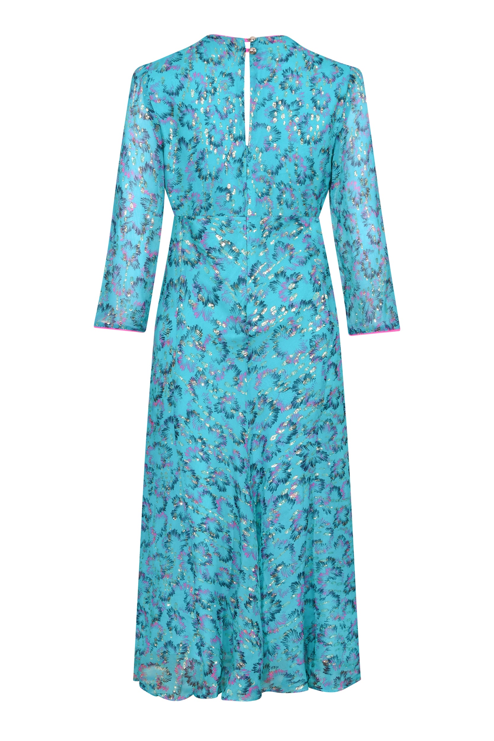 This is one of our favourite dresses of the season - our best selling Jessie Dress, is absolutely beautiful in the stunning Green Awakening Printed Silk Jacquard with small metallic dots woven into it. A gorgeous, flattering shape, with 3/4 sleeves, it is a perfect dress for parties and events throughout the year. It features a diamond panel detail just under the bust that has beautiful soft pleating flowing in to the fullness of the skirt. A winner on every level!