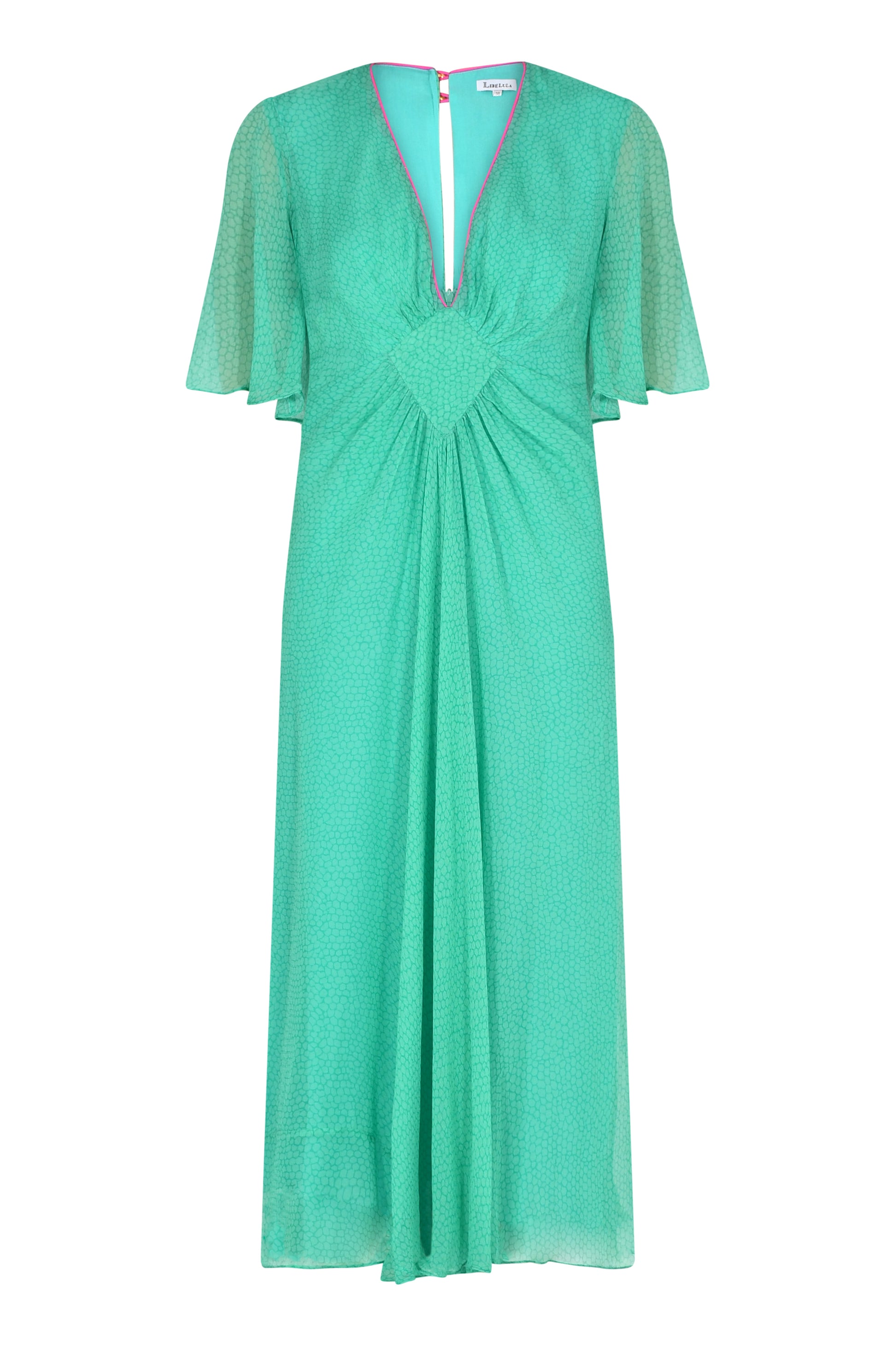 In green tonal silk chiffon, the Jessie Dress is a quietly elevated classic. A diamond‑pleated front gently defines the waist, while soft fullness cascades into a fluid skirt. The silhouette feels both modern and considered with its hot pink trim—ideal for effortlessly moving from daytime affairs to evening moments with unmistakable ease.