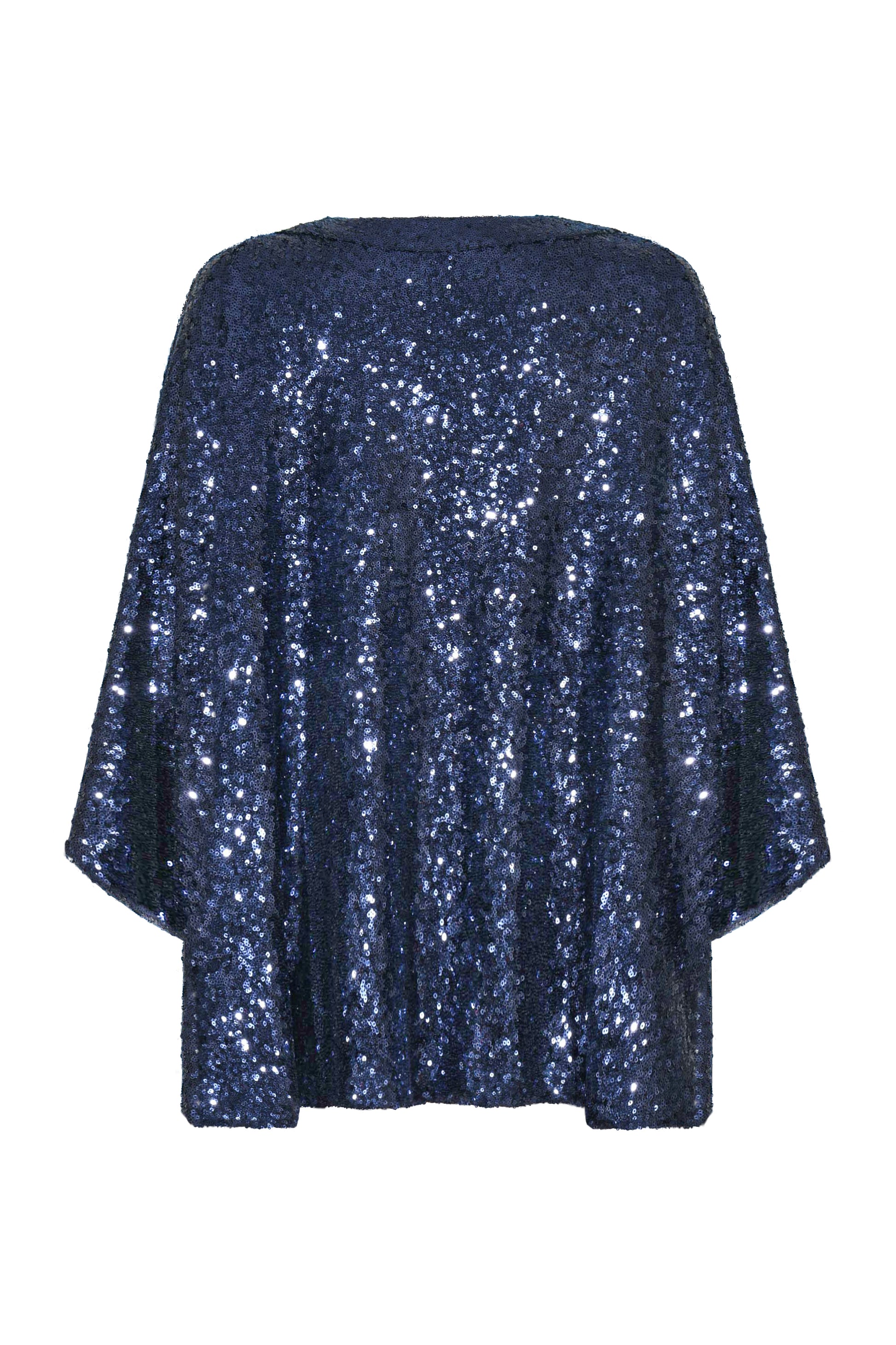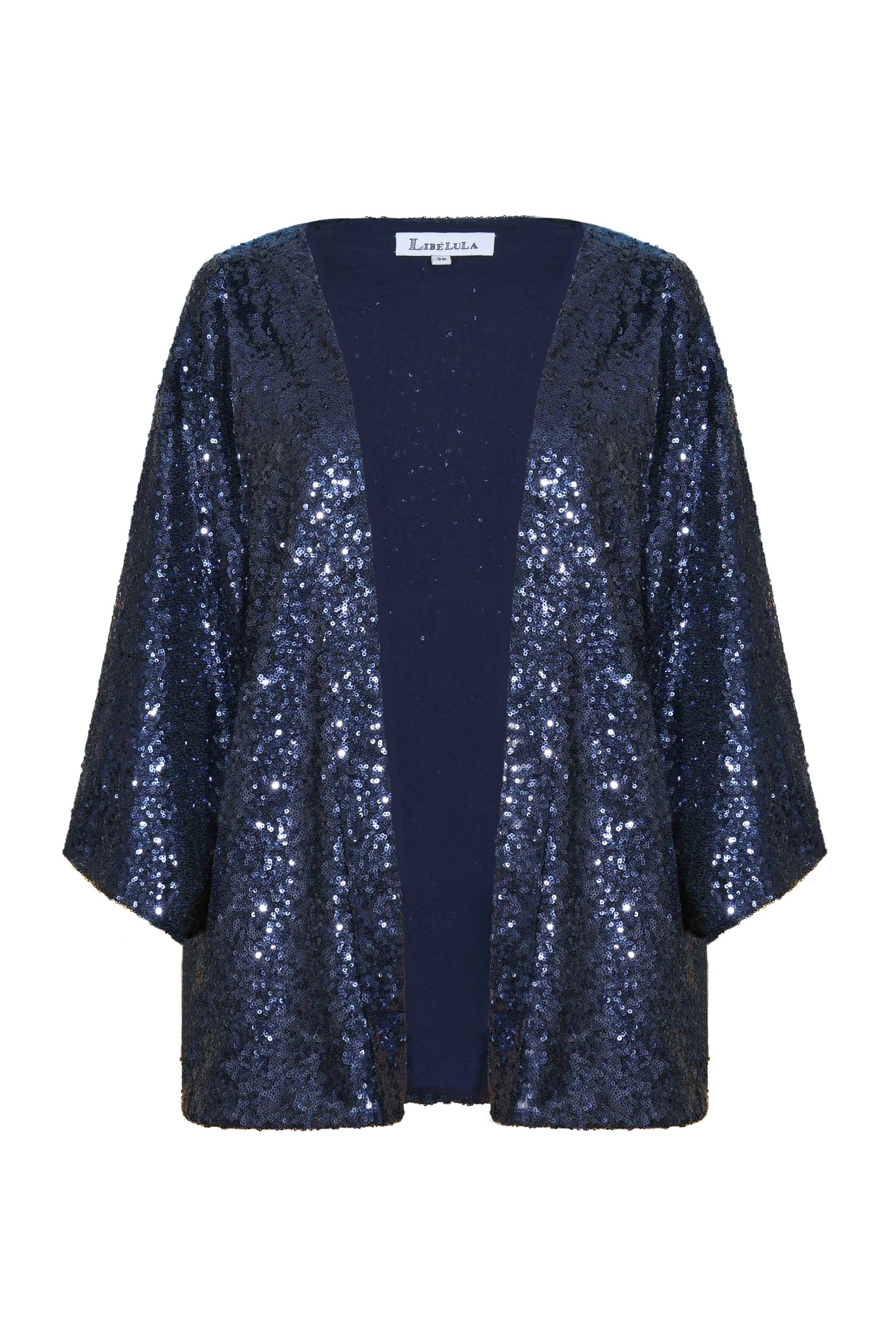 Our beautiful navy sequinned kimono is the perfect evening cover up. Its loose fitting and easy to wear over dresses or jumpsuits or evening trousers.
