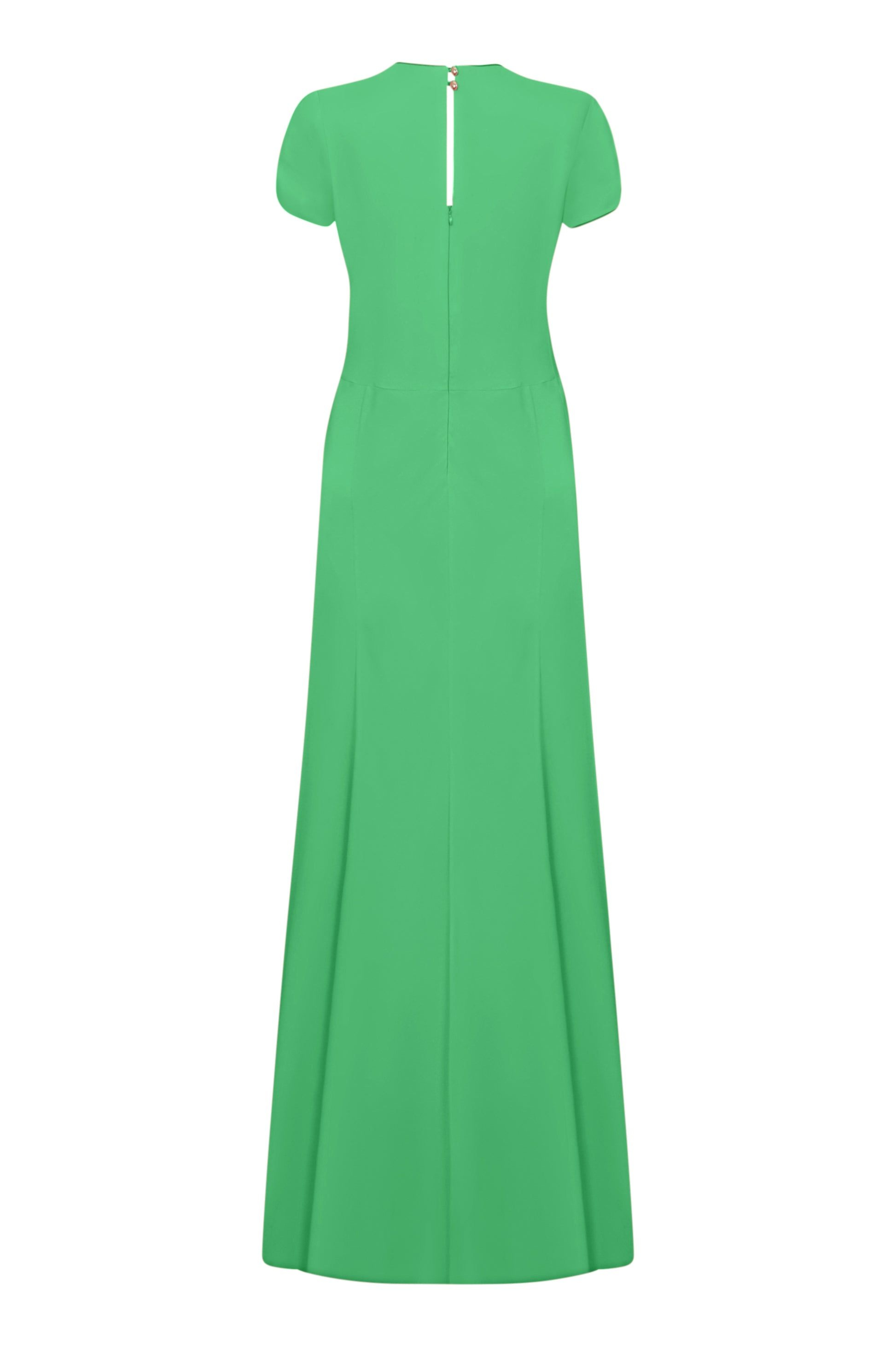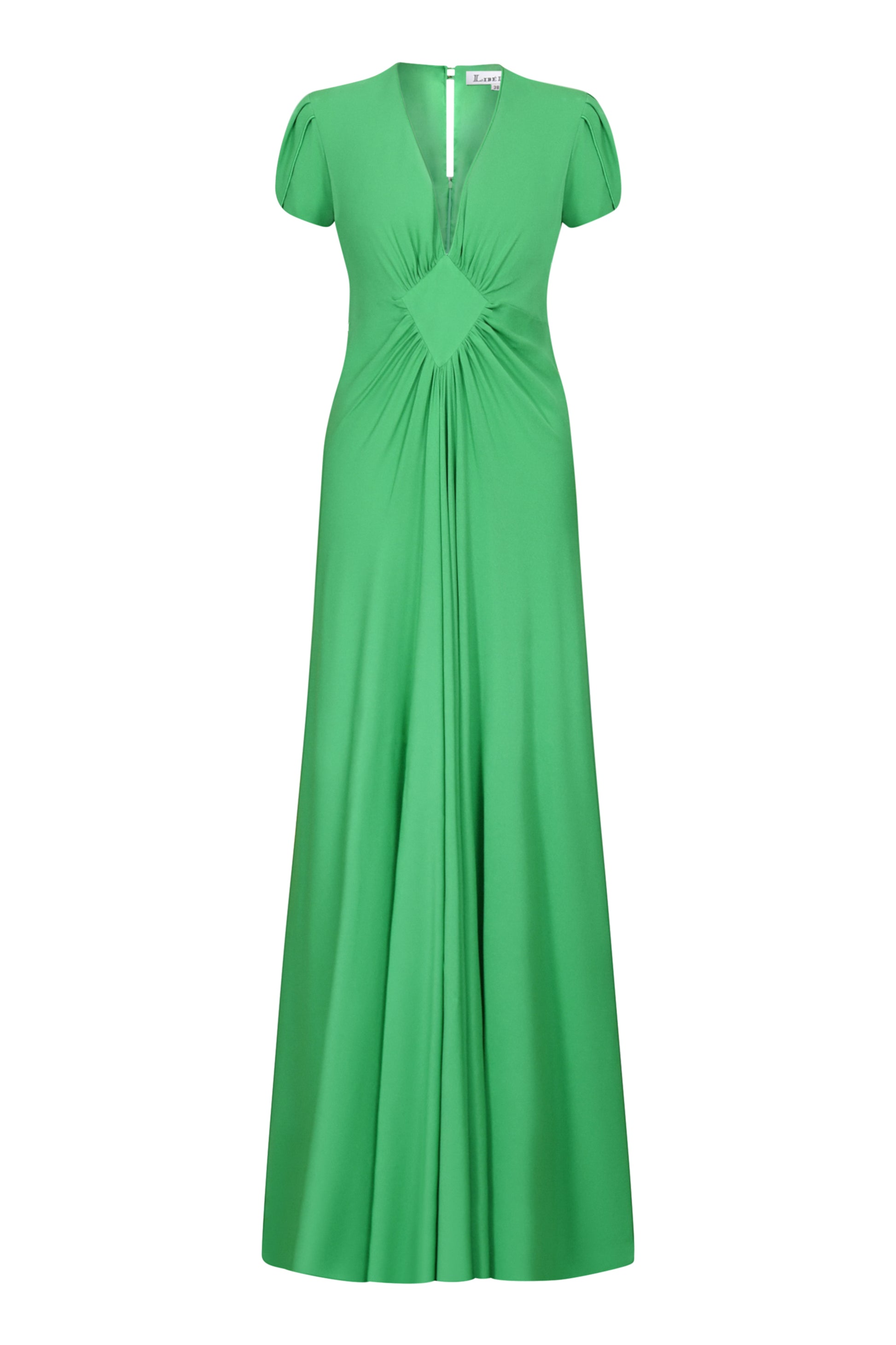 In a beautifully fresh green silk georgette, the Long Jessie Dress frames each moment in statement elegance. pleated sleeves and a subtle diamond‑ruched detail under the bust sculpt a graceful silhouette, while the fluid skirt catches movement with ease. It transitions from sunlit celebrations to evening gatherings with discreet charm—just the kind of considered indulgence that feels both poised and entirely intentional.