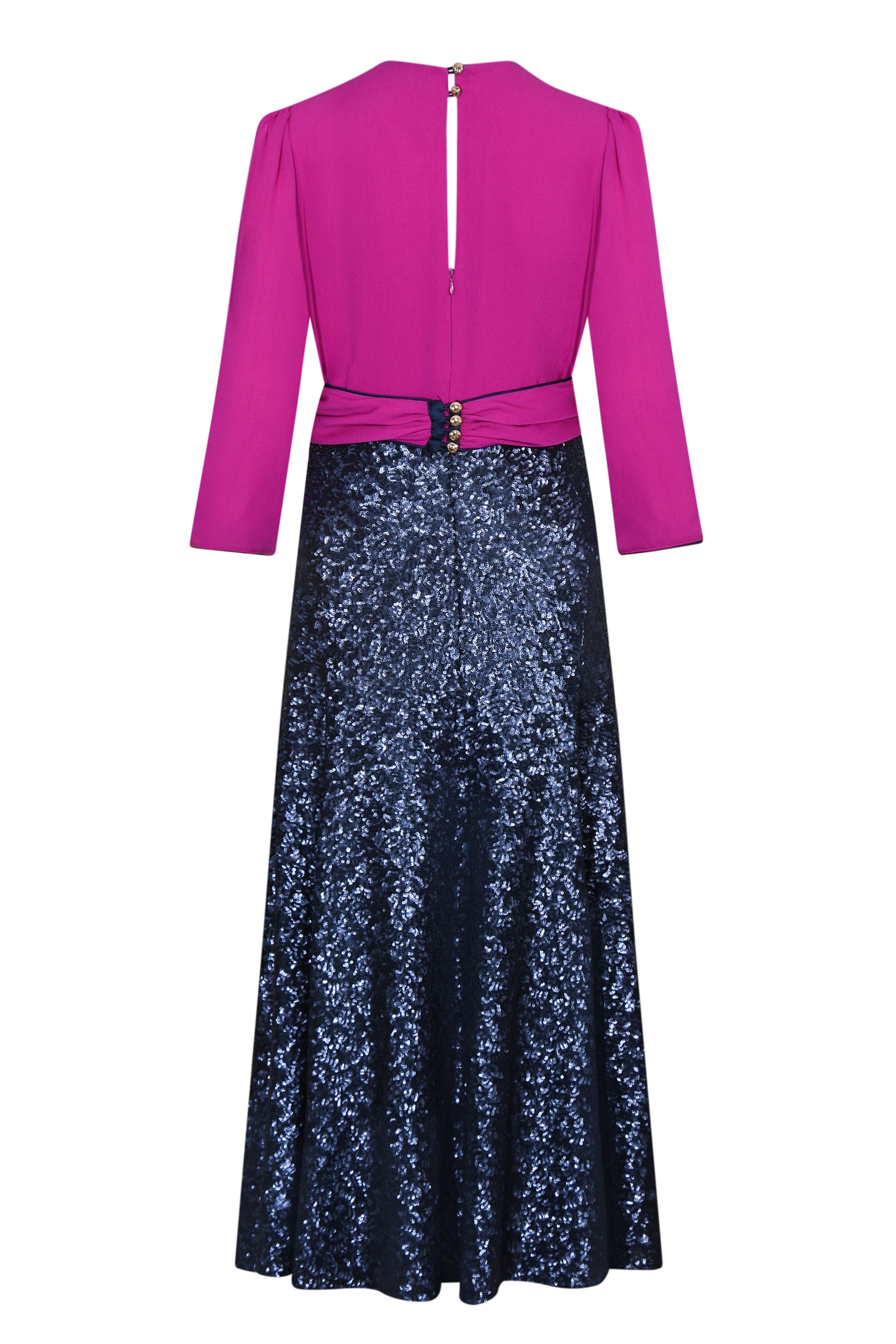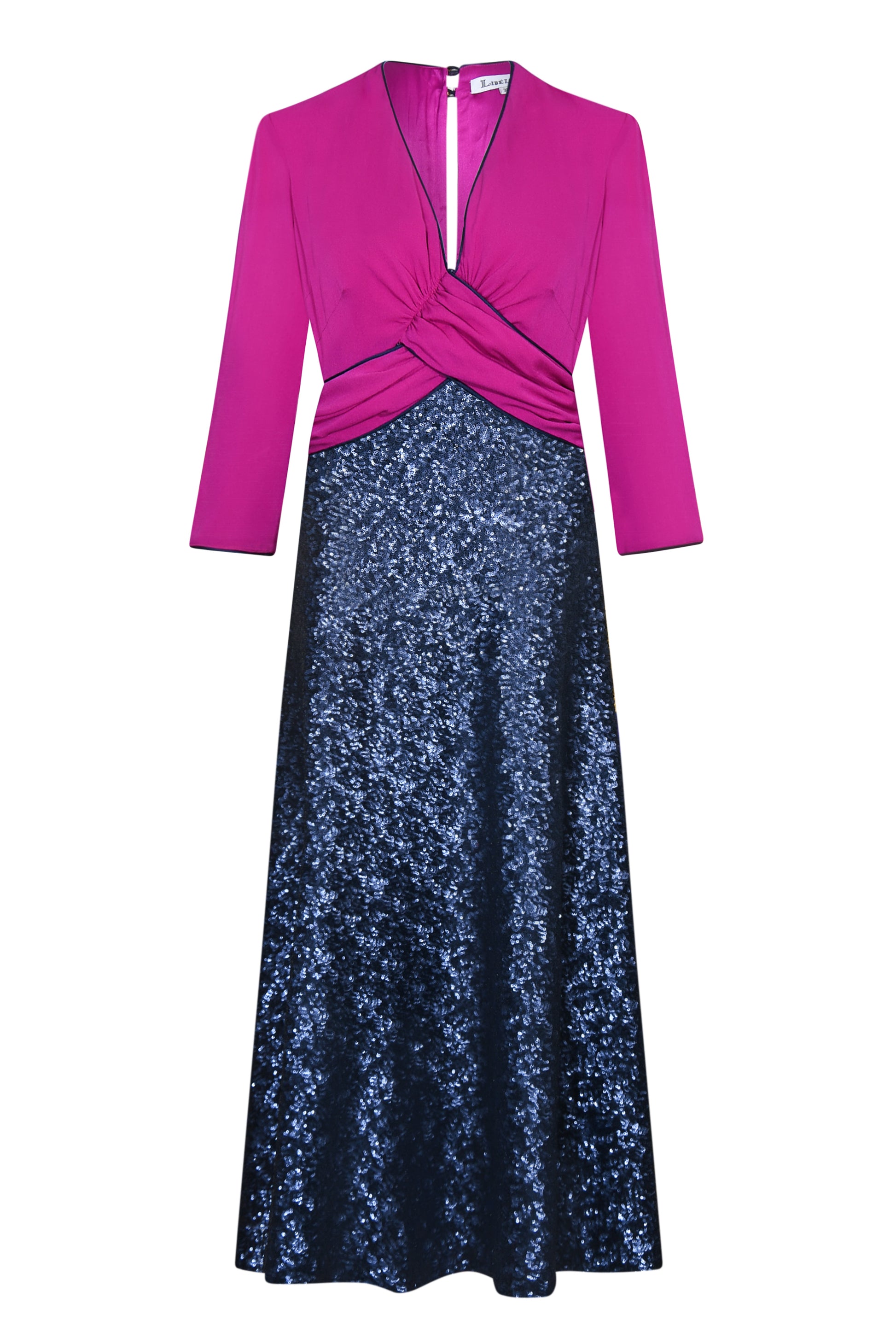 Our timeless Midi Millie Dress is stunning in matt Navy sequins and a bright pink/purple silk georgette, trimmed in a navy silk satin.