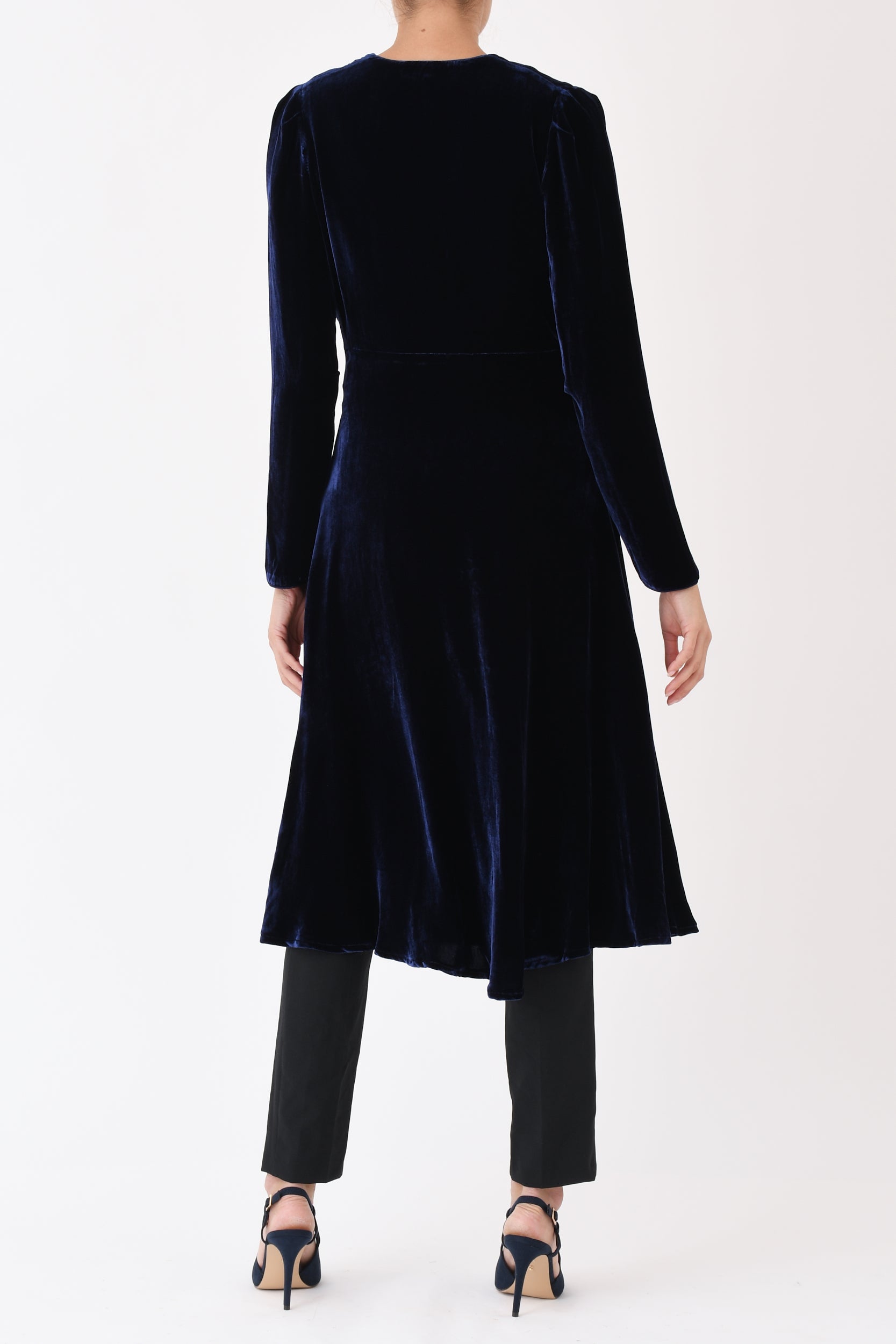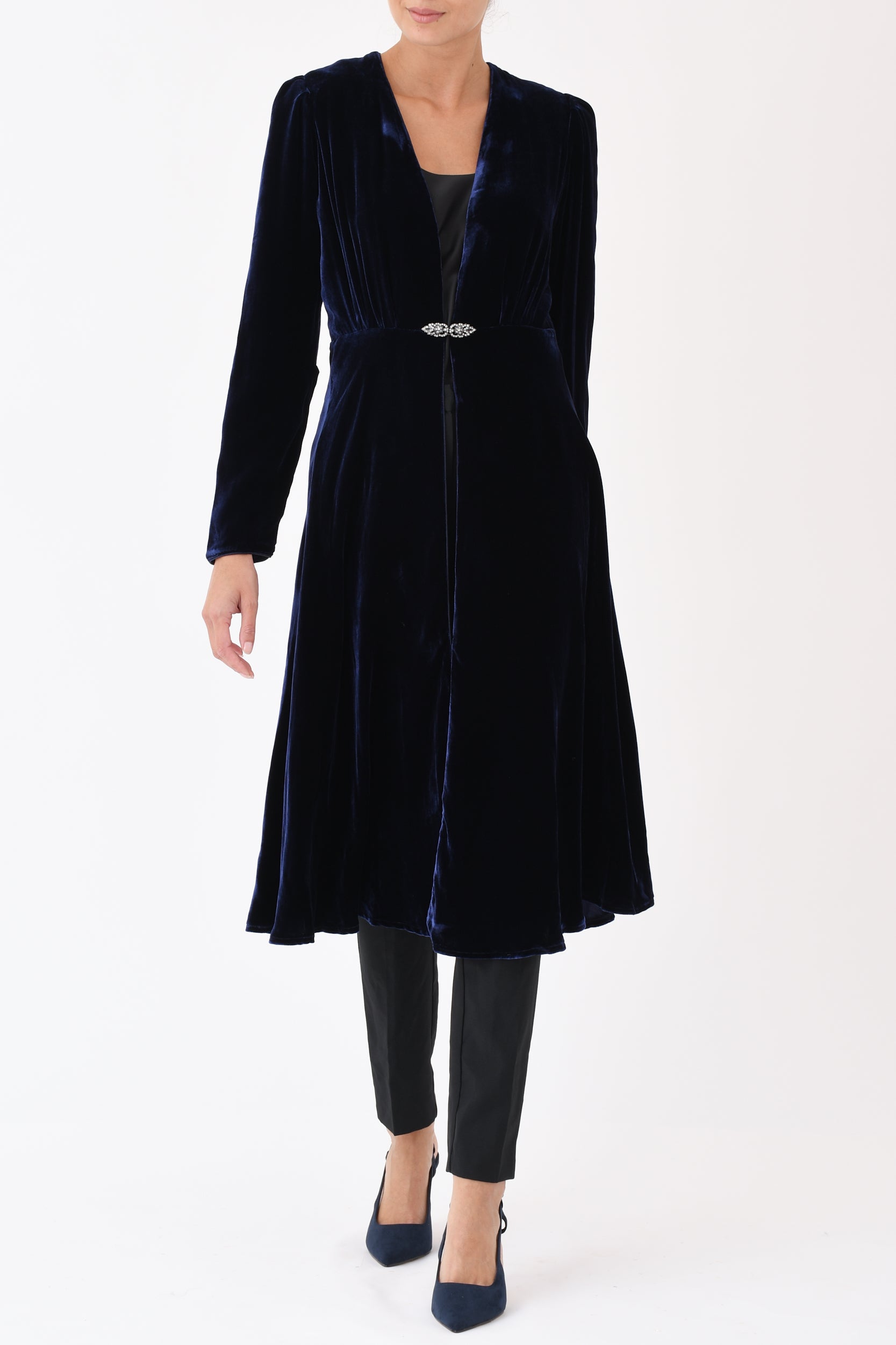 We have updated and improved our famous Dulwich Coat. We have lengthened this stunning evening coat so it can be worn over dresses that come below the knee, we have narrowed the shoulders a little and made the waist a bit more generous...we think it now cannot not be more perfect, in a luxurious deep navy velvet with a silk satin lining and a classic vintage inspired brooch fastening. Elegant and sophisticated, wear this to all your formal occasions but equally great to dress up for a smart/casual evenings too.