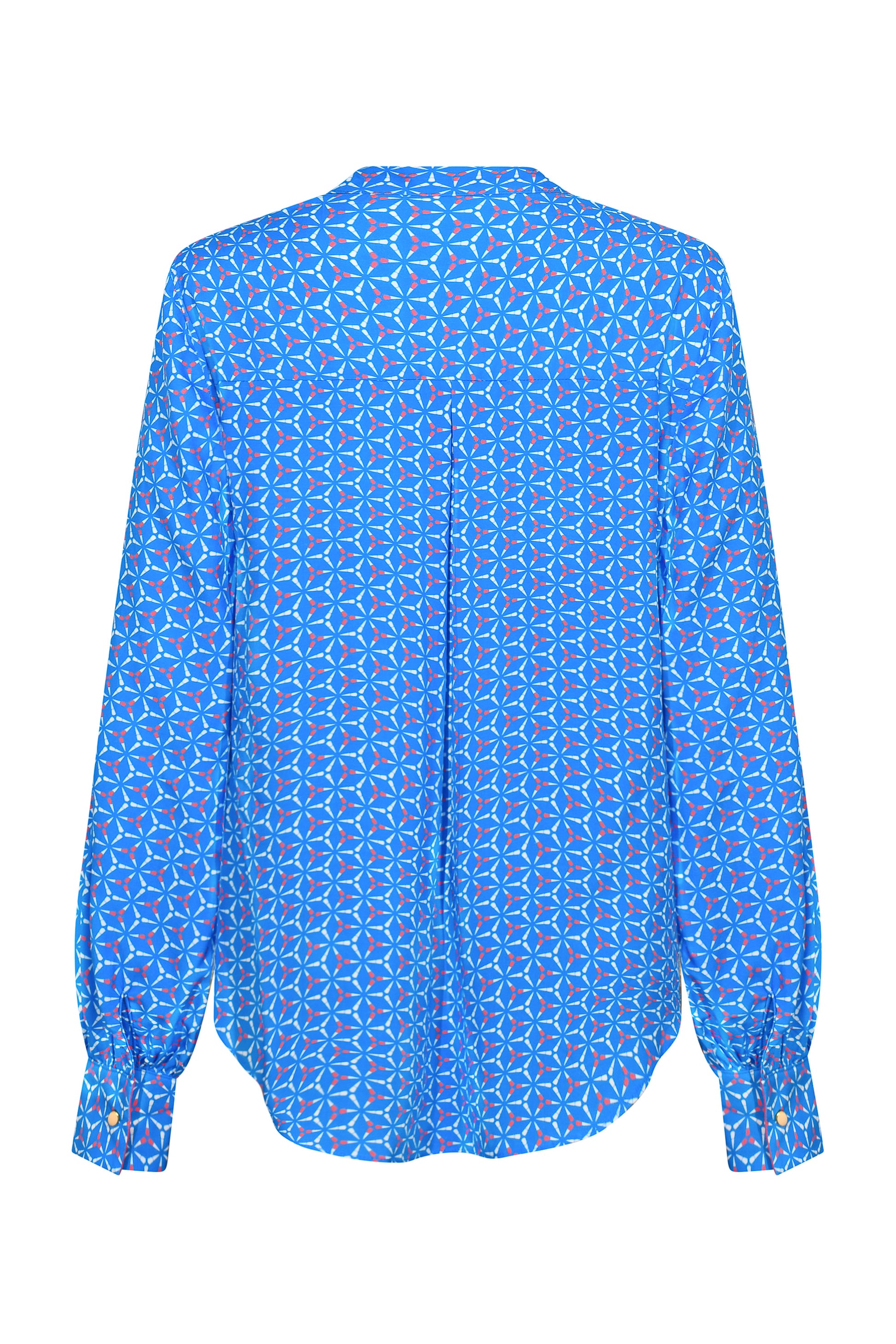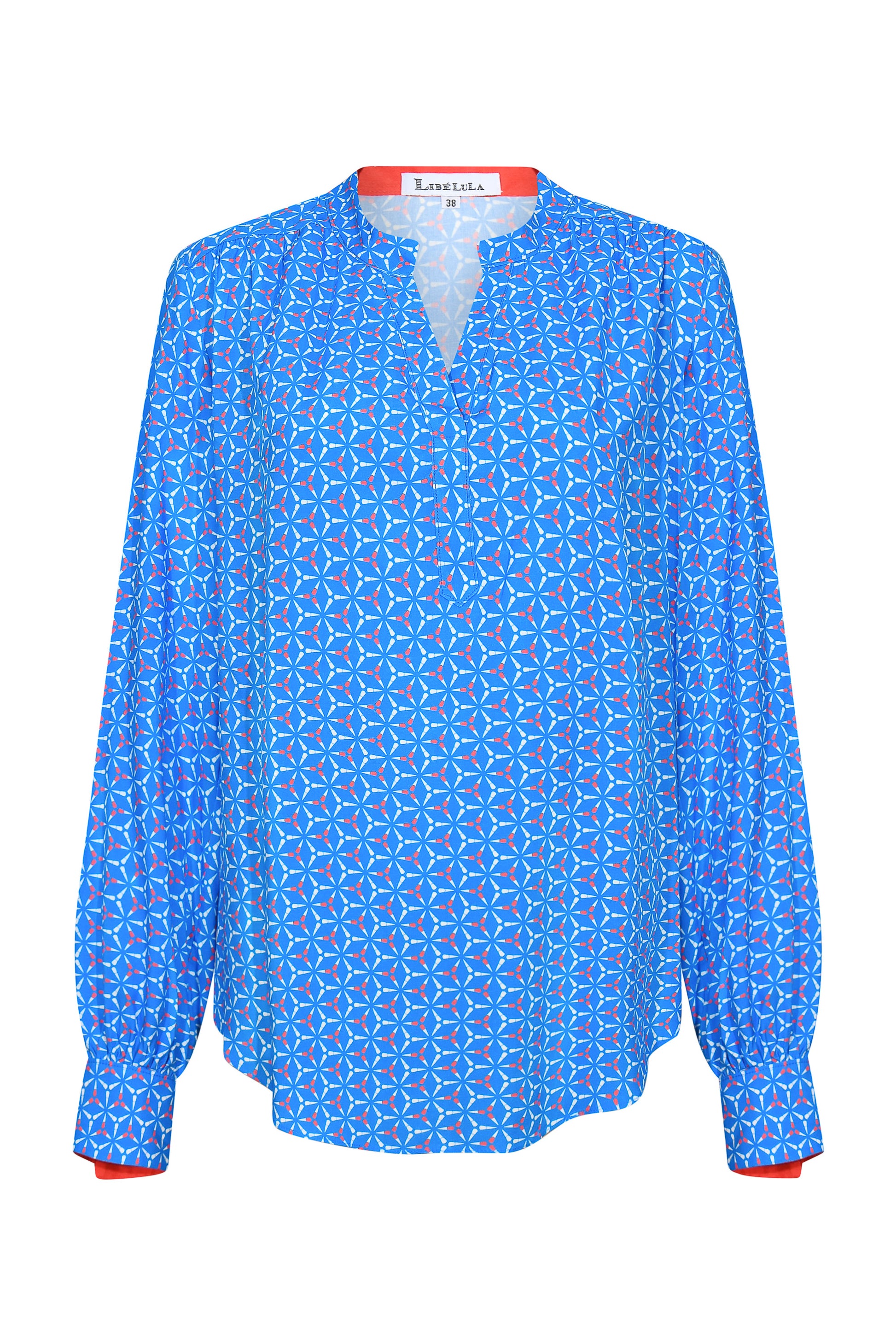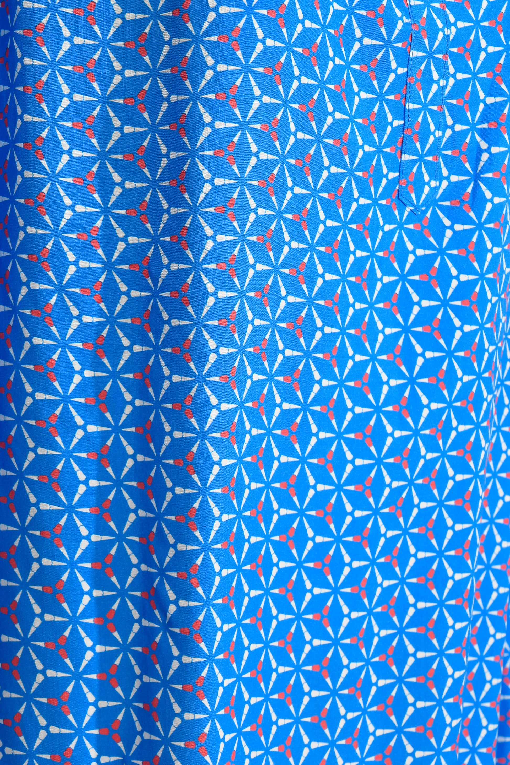 The Silky Top is an easy, stylish style that we bring it back season after season. This season we have made it in the super soft spinning printed rayon in blue with a coral trim inside the collar and cuffs.
