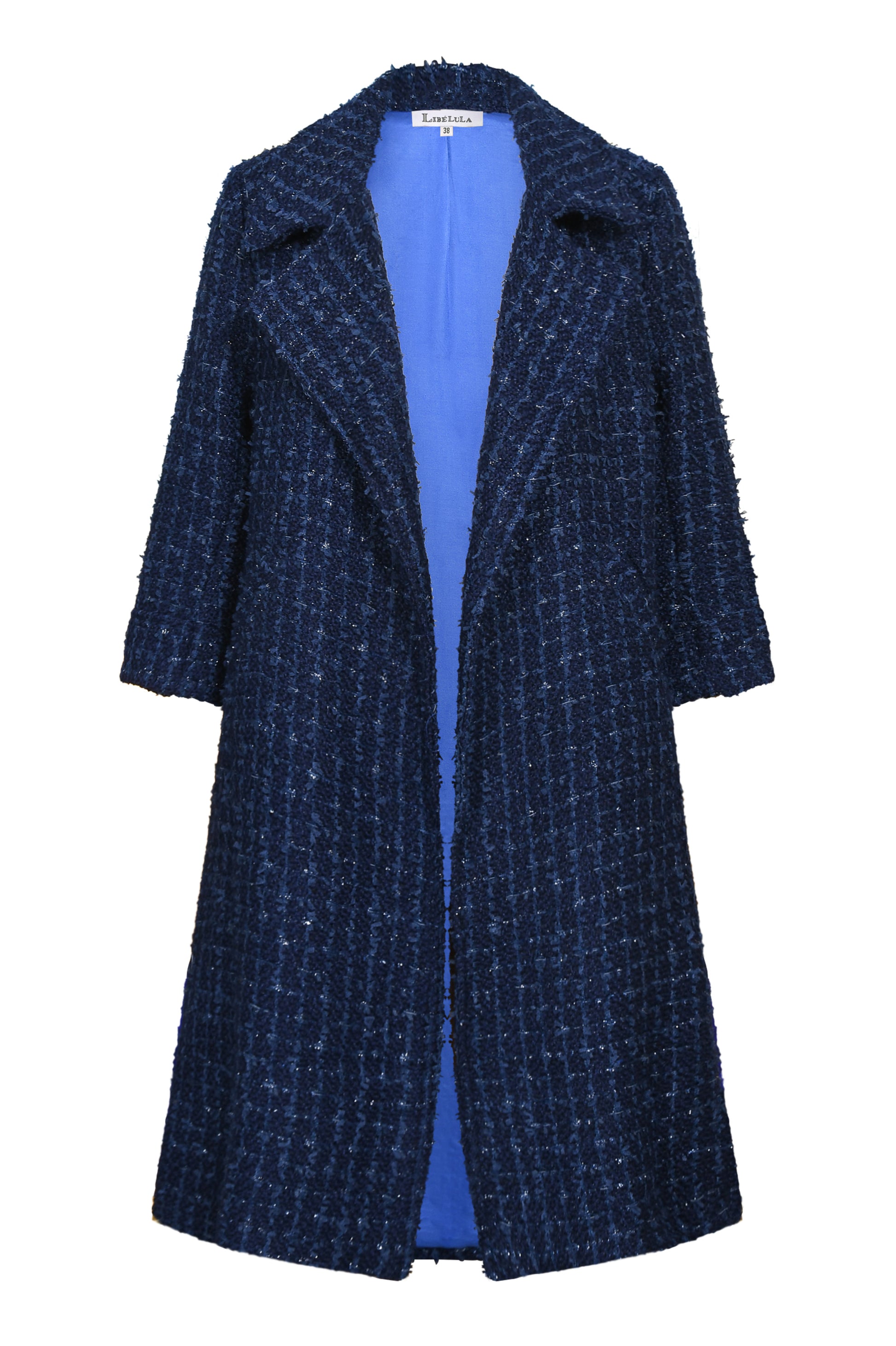 This new style coat is set to be a winner for Libelula this season. A most divine Blue Sparkle Boucle that looks smart and chic. The coat is a wonderful length, sitting just on the knee, the sleeves are very slightly cropped to a 3/4 length, and it features a collar which is lovely and soft and flows in to the full drape of the coat. A fabulous coat that looks amazing over smart evening wear, but equally great over jeans and top for a smart/casual look.