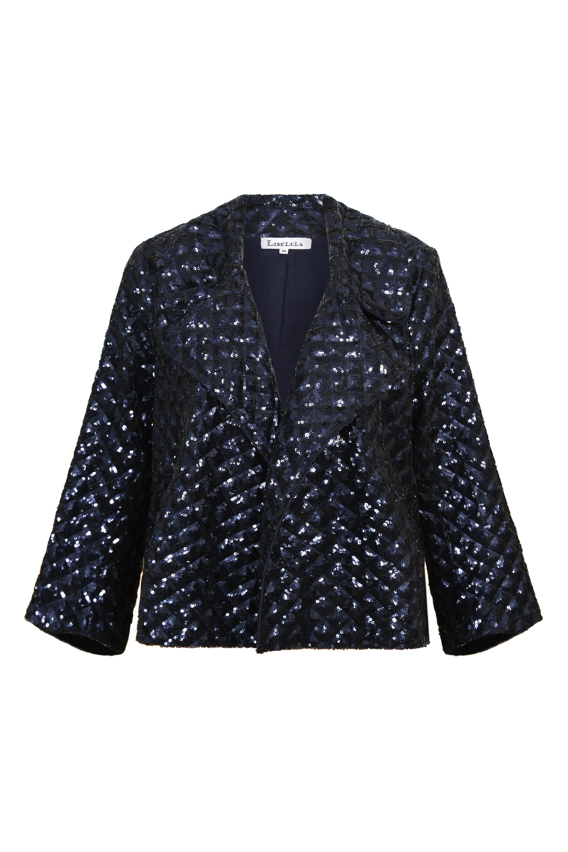 Dazzling Sequined Design — Covered in a diamond‑textured navy sequined net, this jacket catches and reflects light for a refined, glamorous effect.